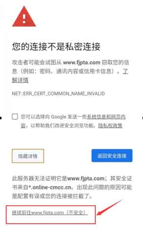 近期有考生反映:在使用本網(wǎng)站主觀題成績(jī)核查、證書(shū)郵寄等功能時(shí),無(wú)法正常訪問(wèn),IE瀏覽器提示403錯(cuò)誤,谷歌瀏覽器提示“您的連接不是私密連接”等情況。經(jīng)排查,發(fā)現(xiàn)是考生使用中國(guó)移動(dòng)的網(wǎng)絡(luò)(包括4G/5G)無(wú)法訪問(wèn)。為保護(hù)廣大考生的信息安全,若在訪問(wèn)本網(wǎng)站過(guò)程中發(fā)現(xiàn)類(lèi)似下圖錯(cuò)誤提示時(shí),請(qǐng)立即暫停訪問(wèn),建議使用中國(guó)電信或中國(guó)聯(lián)通網(wǎng)絡(luò)訪問(wèn)本網(wǎng)站。