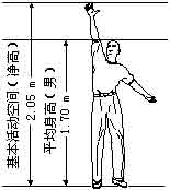 1.2 人民對(duì)生活空間的基本要求房屋是人民生產(chǎn)和生活的基本空間,房屋和房間的設(shè)計(jì)應(yīng)該滿足人民生產(chǎn)和生活的最起碼的活動(dòng)需求。人的基本活動(dòng)空間與房屋層高之間的空間關(guān)系,根據(jù)有關(guān)資料綜合統(tǒng)計(jì)分析,可以形象地表示,如圖1所示。