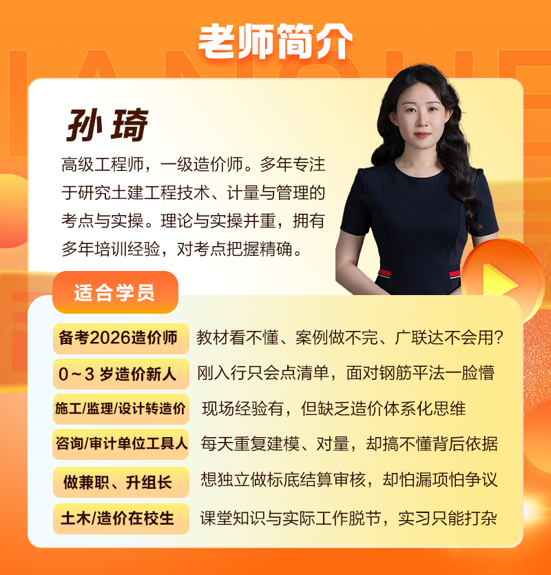 孫琦老師:高級工程師,一級造價師。多年專注于研究土建工程技術(shù)、計量與管理的考點(diǎn)與實(shí)操。理論與實(shí)操并重,擁有多年培訓(xùn)經(jīng)驗(yàn),對考點(diǎn)把握精確。講課細(xì)致耐心,直達(dá)核心找準(zhǔn)問題,理論與實(shí)操并重,原理背景信手拈來。授課該繁則繁,該簡則簡,用“大白話”講透復(fù)雜算法,被學(xué)員親切稱為“孫媽”。