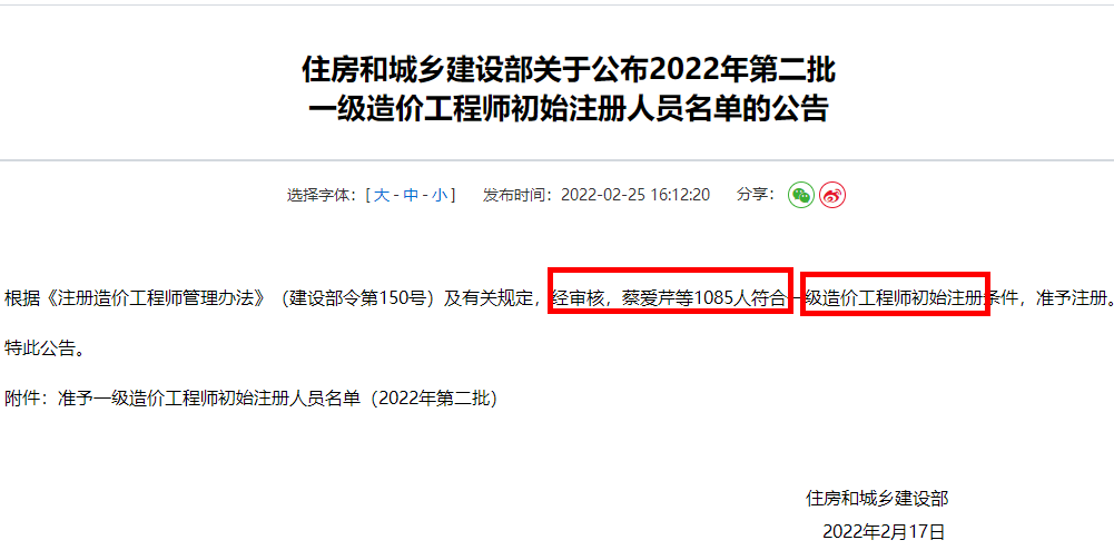 住房和城鄉(xiāng)建設部關于公布2022年第二批一級造價工程師初始注冊人員名單的公告