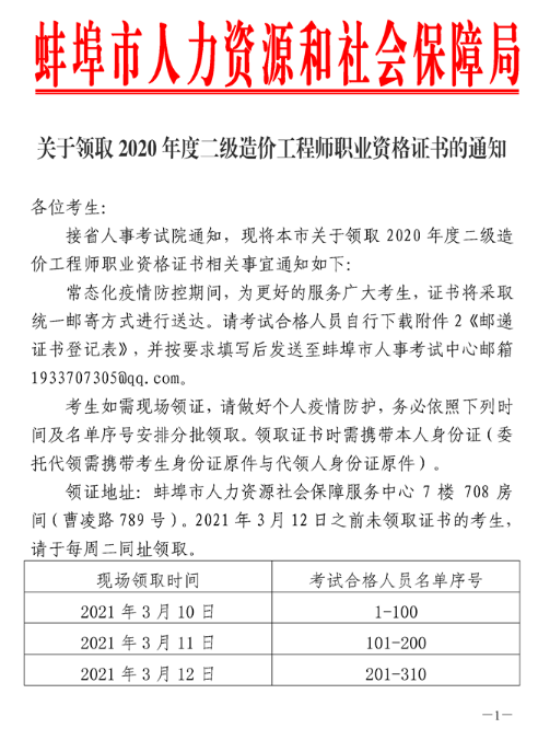 安徽蚌埠3.10-12領(lǐng)取2020年二級造價師執(zhí)業(yè)資格證書