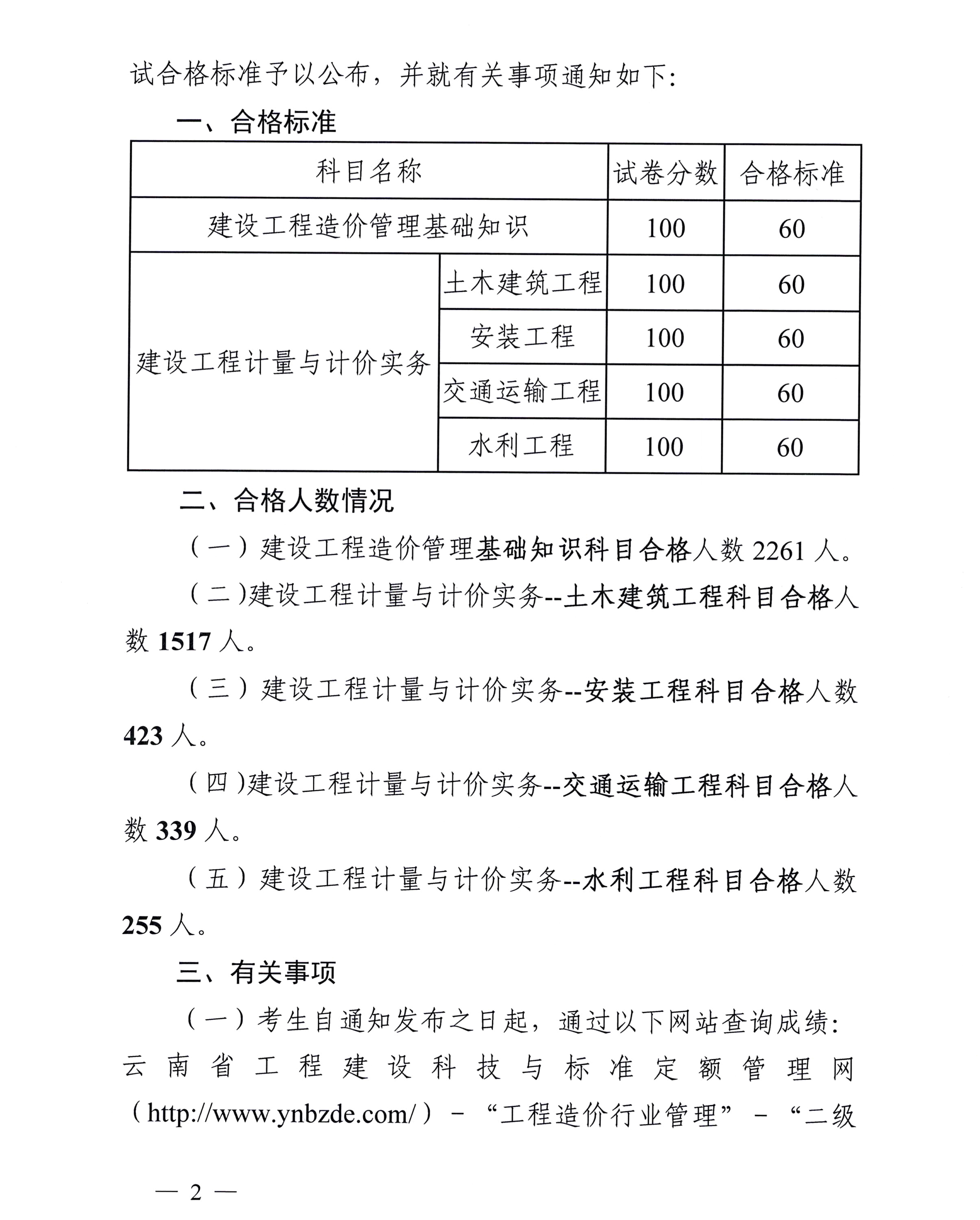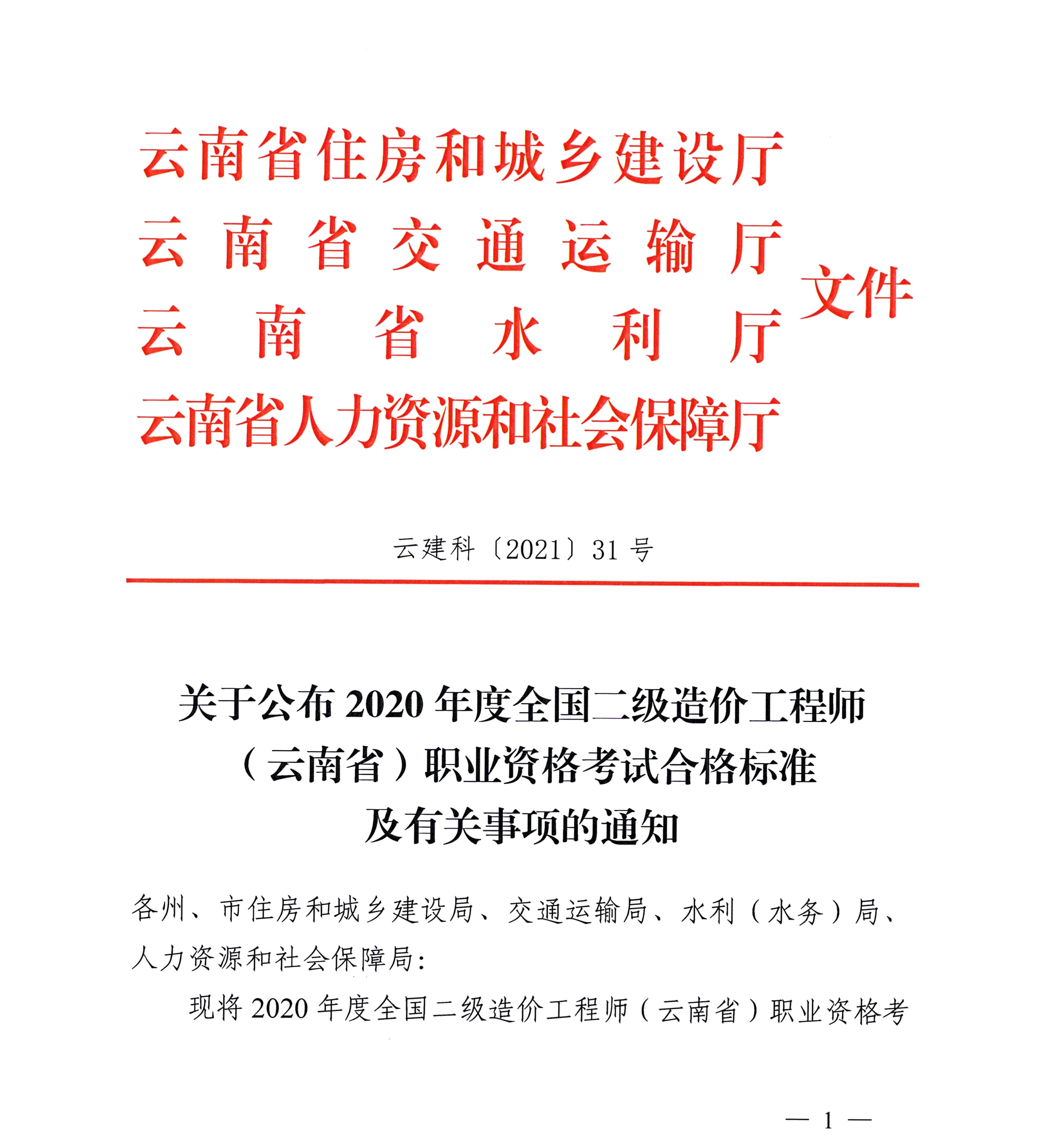 關(guān)于公布2020年度全國二級造價工程師(云南省)職業(yè)資格考試合格標(biāo)準(zhǔn)及有關(guān)事項的通知