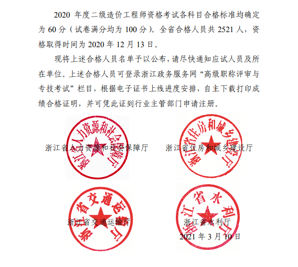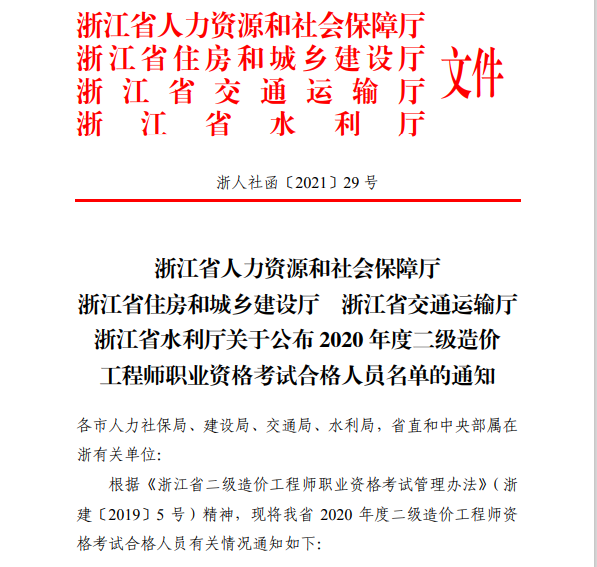 關于公布浙江2020年度二級造價工程師職業(yè)資格考試合格人員名單的通知