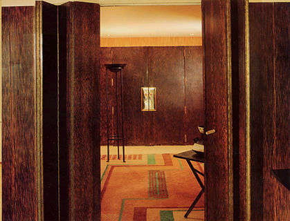 3.Eugène Printz設(shè)計的屋內(nèi)滑動棕櫚大門把玄關(guān)和起居室分隔開。這道大門借鑒了屏風(fēng)的原理,半開半合時,和室內(nèi)另一頭的門互相呼應(yīng)。