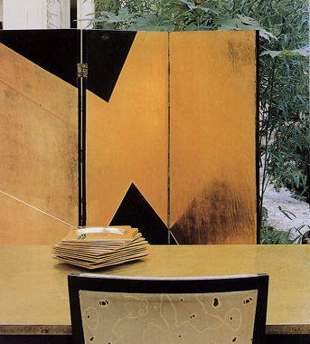 7.表面飾以金箔的1931年產(chǎn)日式屏風(fēng),由Hamanaka出品,風(fēng)格獨一無二。此處,屏風(fēng)把餐廳和花園恰倒好處地一隔為二。