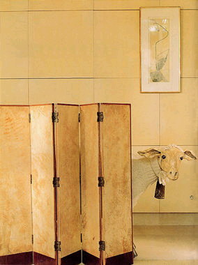 1.讓。米歇爾。法蘭克設(shè)計的桃木羊皮紙面屏風(fēng)。屏風(fēng)后巧妙地放置了一件綿羊雕塑,悄悄地探出頭來,使得藝術(shù)品在家中不至于顯得過于突兀。