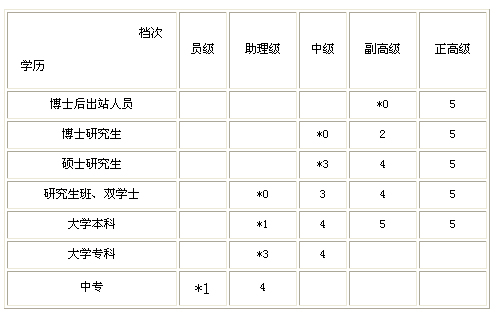 ?、诒碇兴心晗蓿杭?號(hào)為畢業(yè)后從事專業(yè)技術(shù)工作年限,對(duì)應(yīng)檔次為初聘專業(yè)技術(shù)職務(wù);無*號(hào)為該檔次職務(wù)的最低年限。