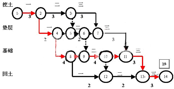?。?)關(guān)鍵線(xiàn)路是1-2-4-8-9-10-11-13-14工期是19天