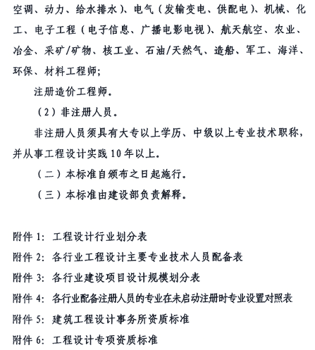 根據(jù)《建設(shè)工程勘察設(shè)計管理條例》和《建設(shè)工程勘察設(shè)計資質(zhì)管理規(guī)定》,我部制定了《工程設(shè)計資質(zhì)標準》,現(xiàn)印發(fā)給你們,請遵照執(zhí)行。原《關(guān)于頒發(fā)工程勘察資質(zhì)分級標準和工程設(shè)計資質(zhì)分級標準的通知》(建設(shè)[2001]22號)中“工程設(shè)計資質(zhì)分級標準”同時廢止。其他有關(guān)規(guī)定與本標準不符的,以本標準為準。執(zhí)行中有何問題,請與我部建筑市場管理司聯(lián)系。