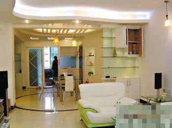 客廳和餐廳相連,但需要有所區(qū)分。設(shè)計師將餐廳地面設(shè)計成圓形,用深色瓷磚鋪設(shè)圓形的界限。與之相呼應(yīng),餐廳的天花也設(shè)計成圓形,中間設(shè)計一些木的假梁,吊燈從梁中間垂垂而下,視覺上比較有藝術(shù)效果,有田園之風(fēng),感覺好像從稻草中垂下。客廳的天花采用了圓弧形,流線型的天花,燈光在天花流線的邊緣透出,給人浪漫、自由的感覺?蛷d與餐廳交接處設(shè)計了放置裝飾品的玻璃層架,層架的下層設(shè)置木柜,方便主人放雜物。