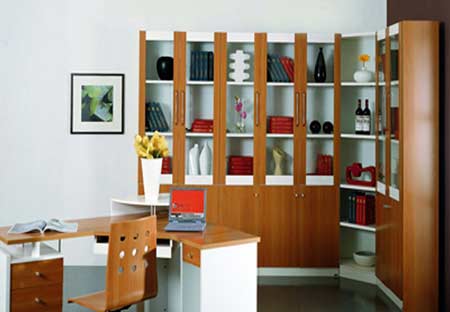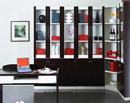這兩款時尚書柜,不僅造型簡單、實用,再配于顏色考究的花瓶等裝飾品,一改以往書房凝重的氛圍,讓學習、工作變得輕松快樂。在整體莊重的柜體色調上,白色的頂端讓人遐想無限。