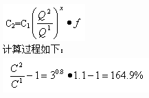 例題:[2006年]按照生產能力指數法(x=0.8,  f=1.1),如將設計中的化工生產系統(tǒng)的生產能力提高到三倍,投資額將增加(   )