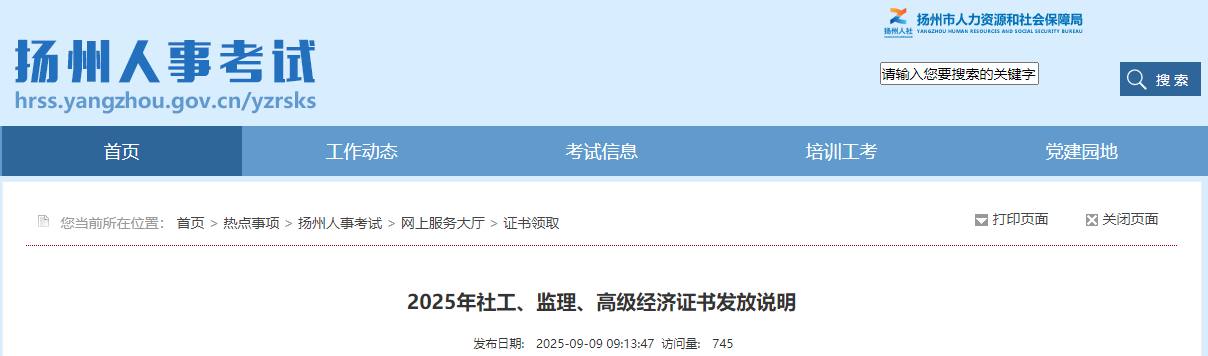 2025年社會(huì)工作者、監(jiān)理工程師、高級(jí)經(jīng)濟(jì)師證書已到。考生可登錄江蘇省人事考試網(wǎng)上業(yè)務(wù)辦理平臺(tái)(jiangsu.nomax.vip/bas)申請(qǐng)到付郵寄,現(xiàn)場(chǎng)發(fā)放地址邗江中路98號(hào)(市考試中心位于揚(yáng)州市工業(yè)職業(yè)技術(shù)學(xué)院內(nèi)華揚(yáng)樓東側(cè)一樓服務(wù)大廳,請(qǐng)配合學(xué)校保衛(wèi)進(jìn)行登記,證書憑考生身份證原件領(lǐng)取)。