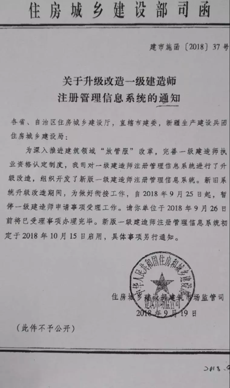 近日住建部司函關(guān)于升級改造一級建造師注冊管理信息系統(tǒng)的通知,明確新版一級建造師注冊管理信息系統(tǒng)定于2018年10月15日啟用。