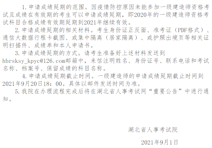 一級建造師資格考試湖北考區(qū)申請成績延期的有關(guān)通知