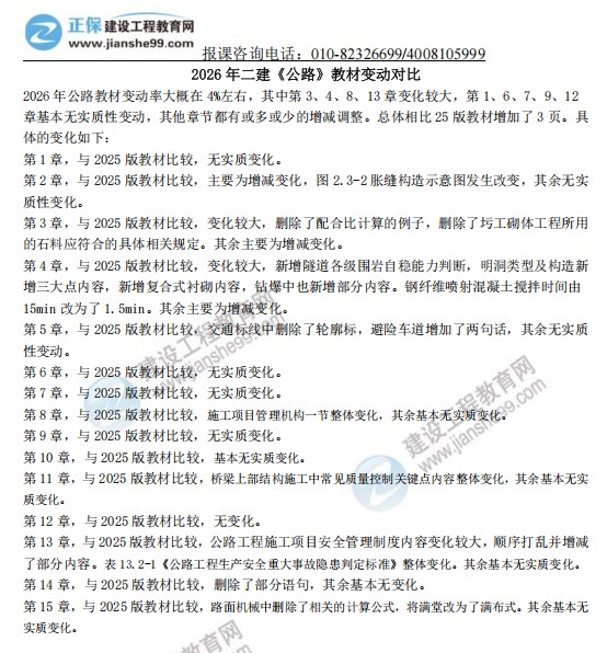 2026年二級建造師《公路實務(wù)》新教材變動梳理出爐!建設(shè)工程教育網(wǎng)教務(wù)團隊拿到教材后第一時間為大家梳理變動詳細內(nèi)容,經(jīng)核對,2026年公路實務(wù)科目整體變動約4%,教材變動內(nèi)容如下,更多變動解讀請關(guān)注8月27日19:00聶旺老師直播間!