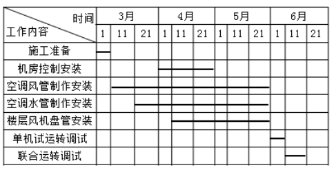A安裝公司進場后,因建設(shè)單位采購的設(shè)備晚于風(fēng)管制作安裝的開工時間,A安裝公司及時聯(lián)絡(luò)空調(diào)設(shè)備供應(yīng)商,了解設(shè)備的各類參數(shù)及到場時間并與B建筑公司協(xié)調(diào)交叉配合施工的時間與節(jié)點,編制了施工進度計劃(見表1)并根據(jù)施工進度計劃,制定了能體現(xiàn)合理施工順序的作業(yè)進度計劃。為保證安裝質(zhì)量,A安裝公司將冷水機組找正等施工工序設(shè)置為質(zhì)量控制點。