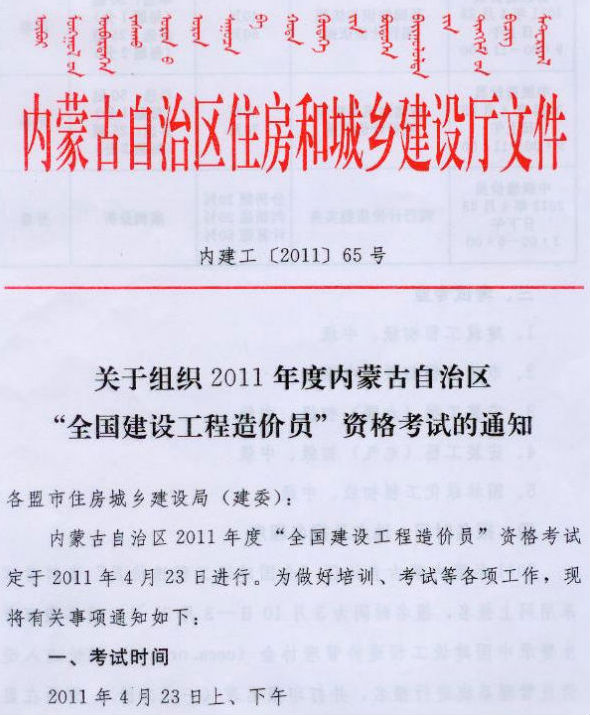 2011年內(nèi)蒙古造價(jià)員考試報(bào)名時(shí)間為3月10日-31日
