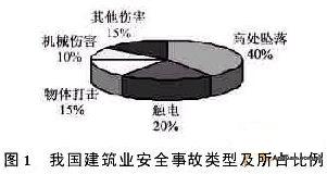 。2)嚴(yán)峻的一面隨著我國建筑業(yè)規(guī)模逐年增加,傷害事故和死亡人數(shù)也一直高居不下。2000年發(fā)生846起、死亡987人,2001.年發(fā)生1.004起、死亡1.045人,2002年發(fā)生1.208起、死亡1.292人。2003年上半年,全國共發(fā)生建筑施工事故51.9起、死亡582人,與2002年同期相比,事故數(shù)和死亡人數(shù)分別上升245%和207%;一些經(jīng)濟大。ㄖ陛犑校,事故傷亡人數(shù)隨建設(shè)規(guī)模增大呈上升趨勢。高處墜落、觸電、物體打擊、機械傷害等仍是我國安全事故的主要類型。它們幾乎占了總事故的80%以上,我國建筑業(yè)安全事故類型及所占比例如圖1所示。