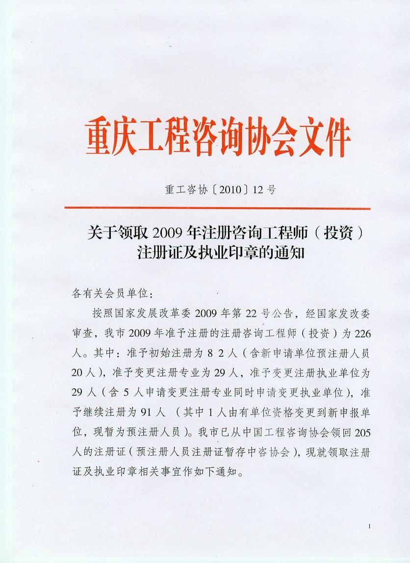 重慶市領(lǐng)取09年咨詢工程師注冊證及執(zhí)業(yè)印章的通知