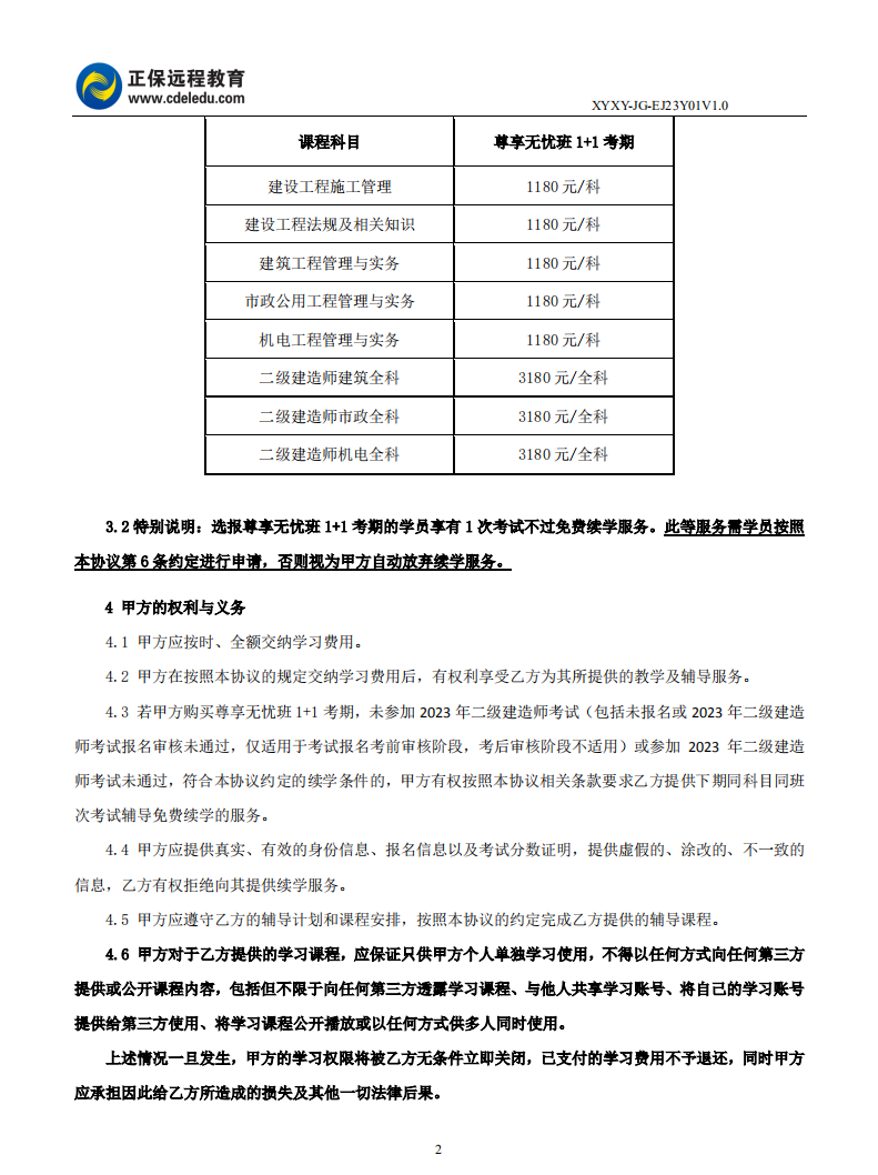 2023年二級建造師尊享無憂班1+1考期協(xié)議書