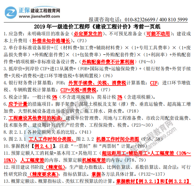 2019年一級造價師《建設(shè)工程計價》考前一頁紙