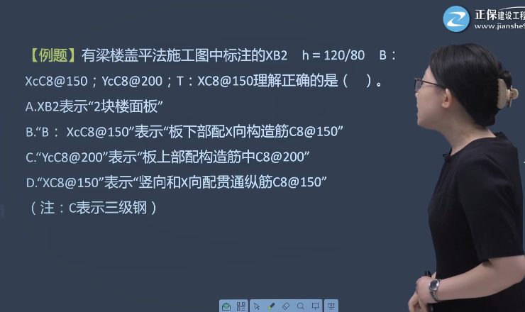 【2025年】根據(jù)平法標(biāo)準(zhǔn)圖集板塊集中標(biāo)注注寫為XB2 h=120 B:Xc8@150,Y8@200 T:18@150,下列表示其含義的說法,正確的是()。