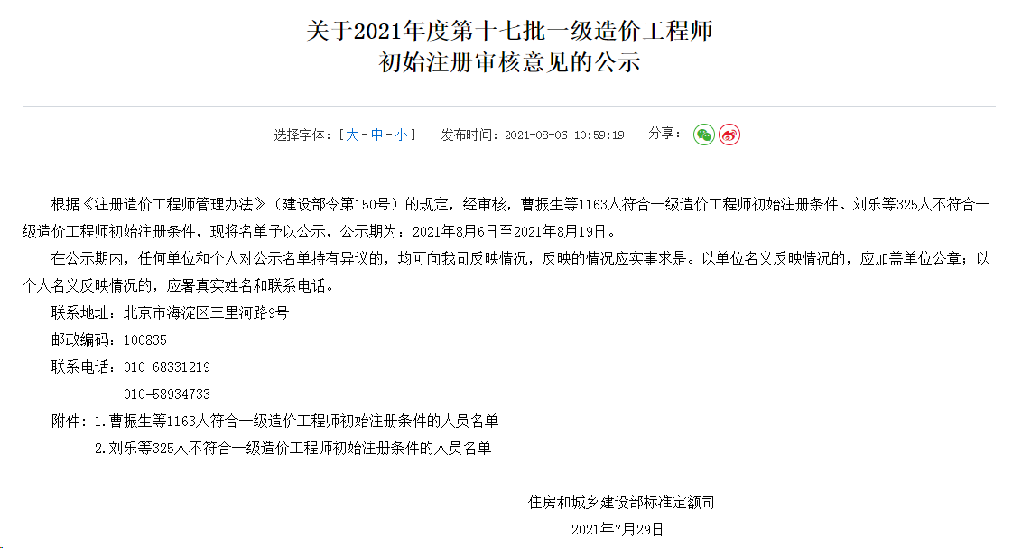 關(guān)于2021年度第十七批一級造價工程師初始注冊審核意見的公示