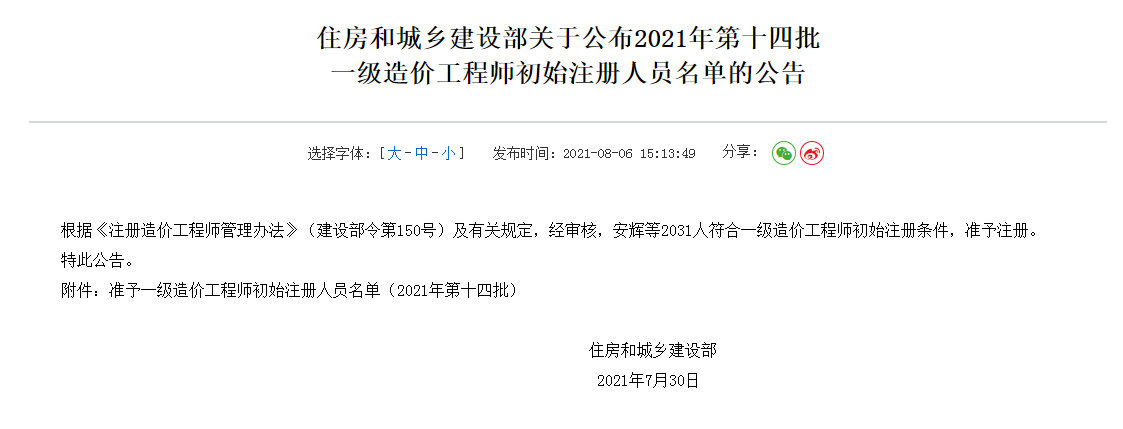 關(guān)于公布2021年第十四批一級(jí)造價(jià)工程師初始注冊(cè)人員名單的公告