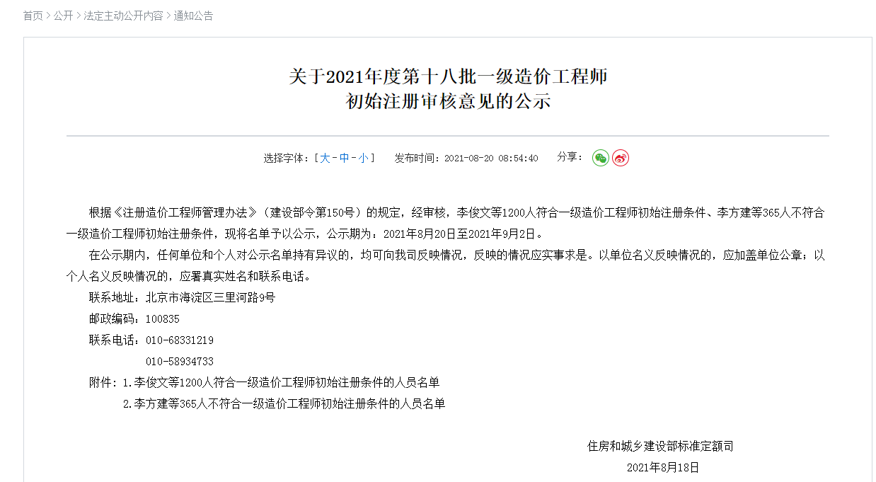 根據(jù)《注冊造價工程師管理辦法》(建設部令第150號)的規(guī)定,經(jīng)審核,李俊文等1200人符合一級造價工程師初始注冊條件、李方建等365人不符合一級造價工程師初始注冊條件,現(xiàn)將名單予以公示,公示期為:2021年8月20日至2021年9月2日。