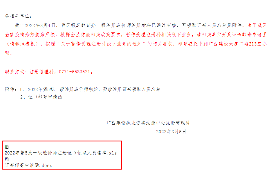 廣西領(lǐng)取2022年第5批一級造價工程師初始、延續(xù)注冊證書事宜的通知