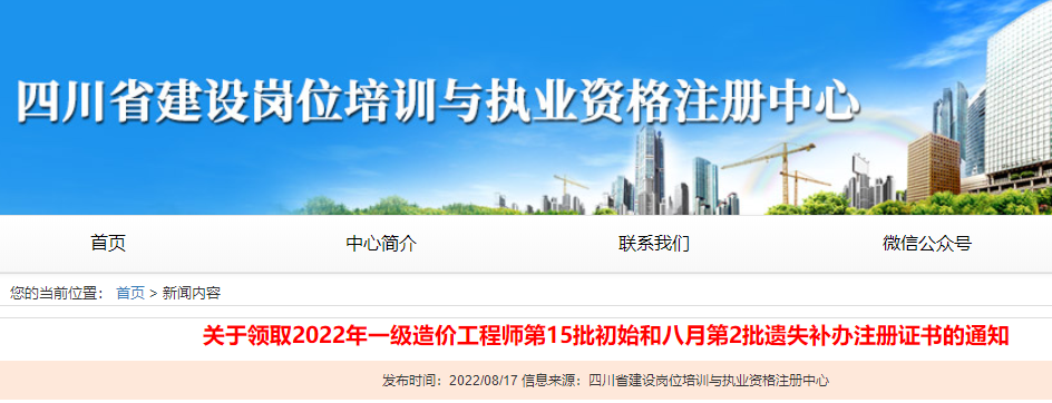 四川領(lǐng)取2022年一級造價師第15批初始和八月第2批遺失補辦注冊證書的通知