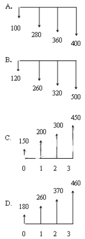 24.在資金時(shí)間價(jià)值的作用下,下列現(xiàn)金流量圖(單位:萬(wàn)元)中,有可能與現(xiàn)金流入現(xiàn)值1200萬(wàn)元等值的是()