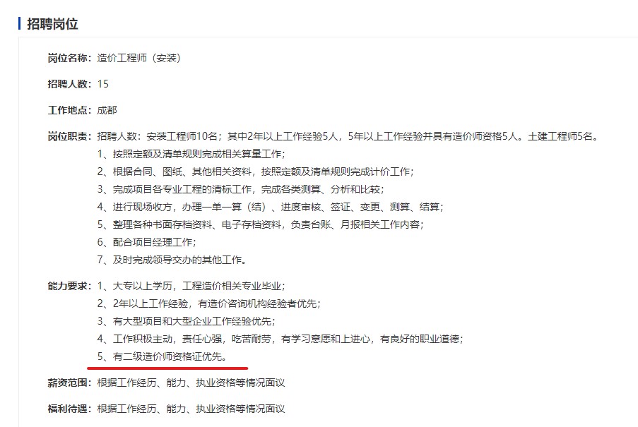 近日四川有兩家大型建設(shè)工程公司發(fā)布了招聘簡章,分別招聘安裝、土建造價員,都要求有二造證書。