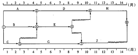 【答案解析】自由時差=該工作與其緊后工作之間波形線水平投影長度的最小值,E工作的緊后工作有兩個,分別是H工作和J工作,E工作緊后有兩個波形線,其持續(xù)時間分別為2和1,那么E的自由時差則為1。而總時差=該工作其后各工作的波形線的持續(xù)時間之和的最小值,E工作后的波形線的持續(xù)時間分別為E→H(2),E→J(3),那么最小值為2,所以其總時差為2。